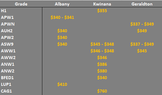 Note: GTA location differentials are used to convert prices to a port equivalent price, actual freight rates can differ particularly in the eastern states. You can offer any grade for sale to create demand.