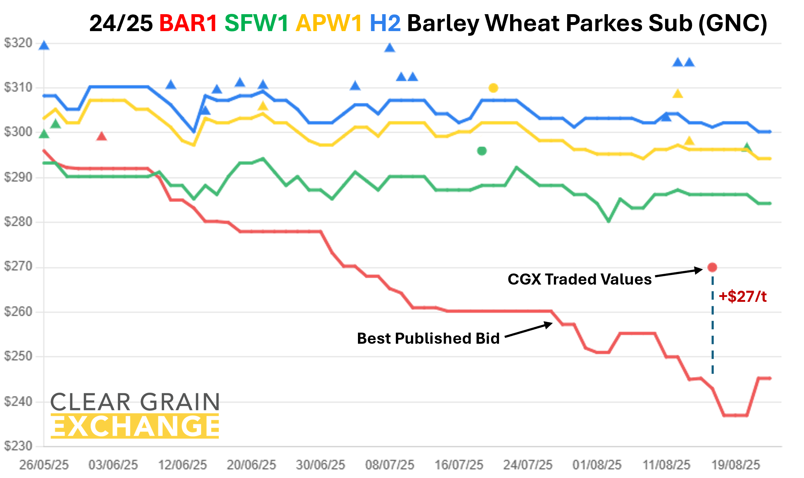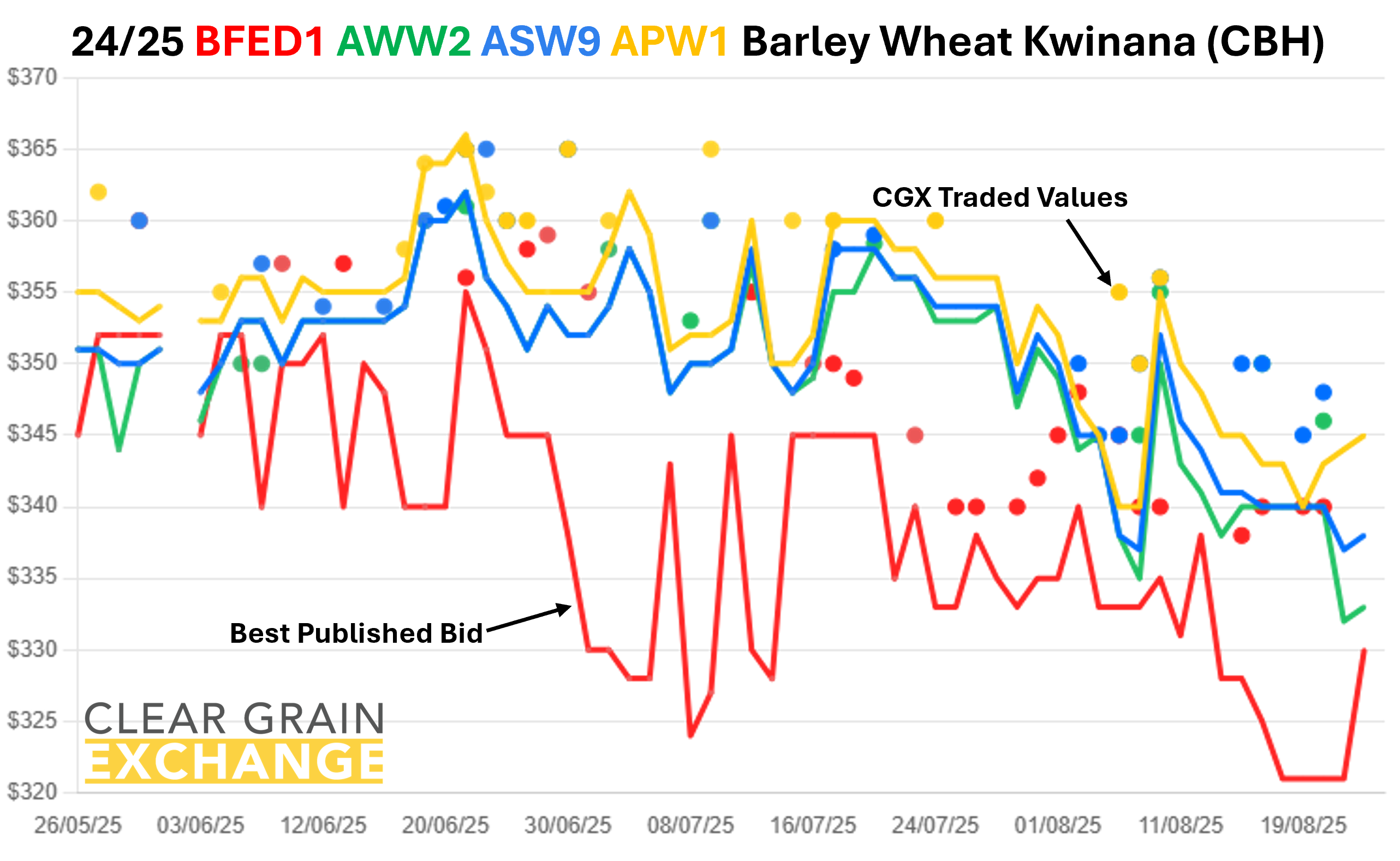 The prices traded through the exchange at a port track (eastern states) or FIS (in WA) level are provided below, but if you're reading this email you will have your own CGX account so login and use it to see what's trading, what's offered, and what's being bid at sites to help you determine the value of grain in your area.