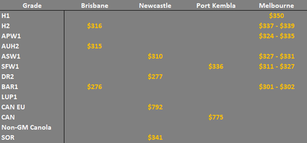 Growers are impacting prices - Grain sold last week averaged $8.95/t above best published bids, some wheat grades traded up to $30/t above.