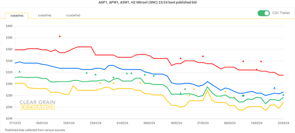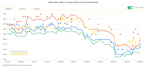 27 buyers purchased 17 grades of wheat with some price spreads still evident between the higher priced milling and niche grades (such as noodle) compared with feed grades (refer to tables with traded prices below).