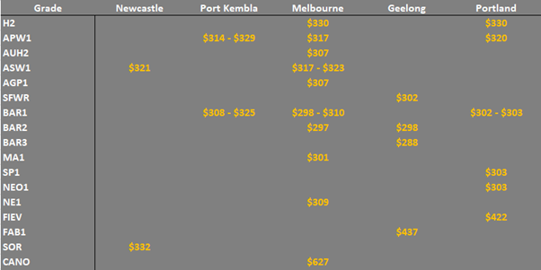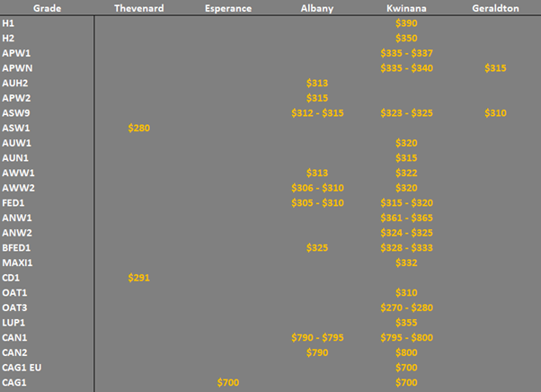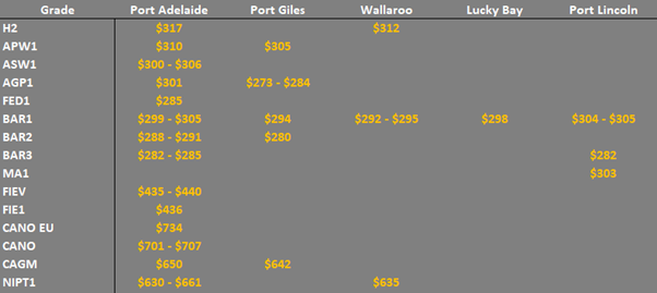 ASW1 wheat was trading $323/t track Melbourne, $321/t Newcastle, $306/t Pt Adelaide and the equivalent AWW1 grade in WA was trading $322/t FIS Kwinana.