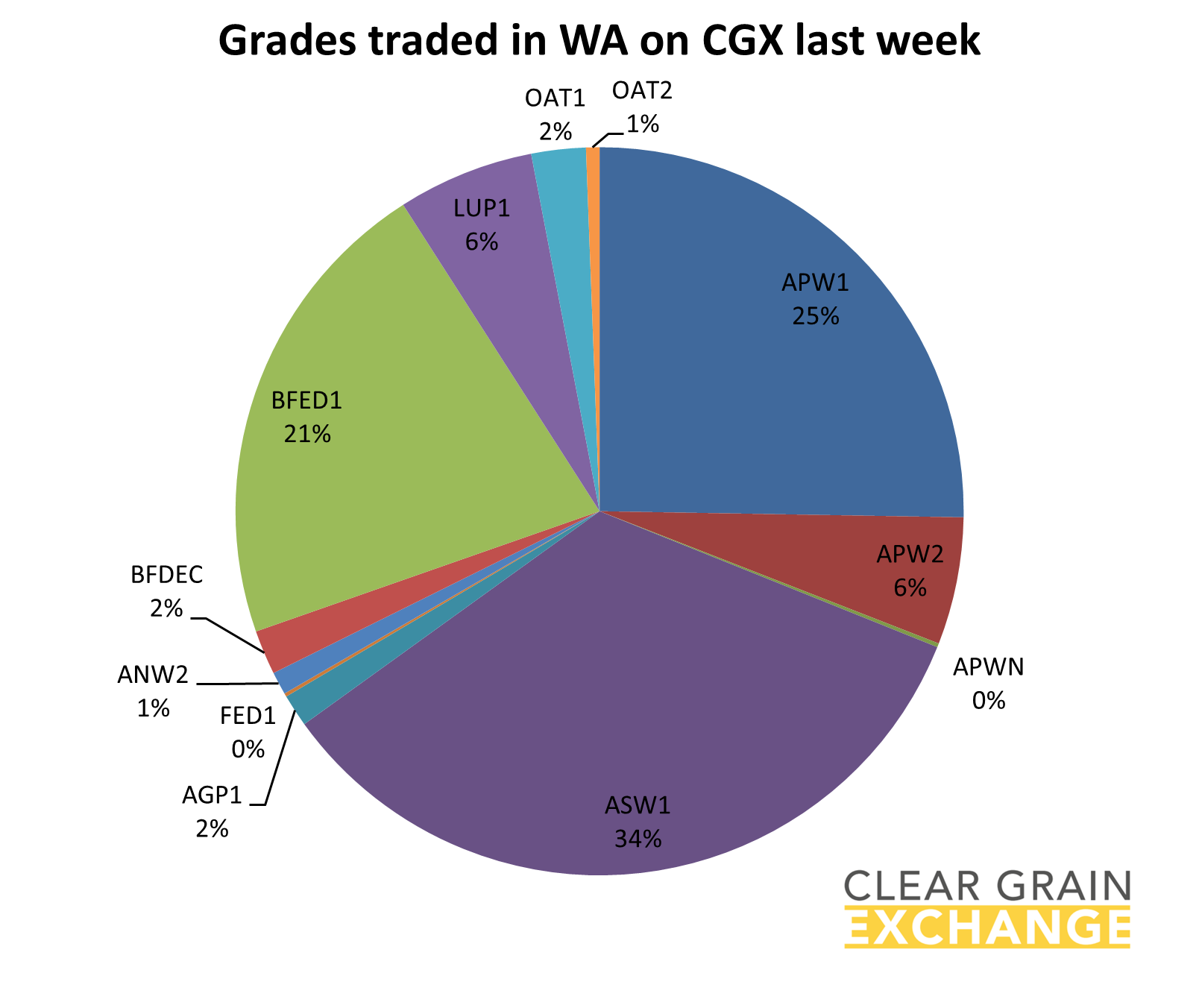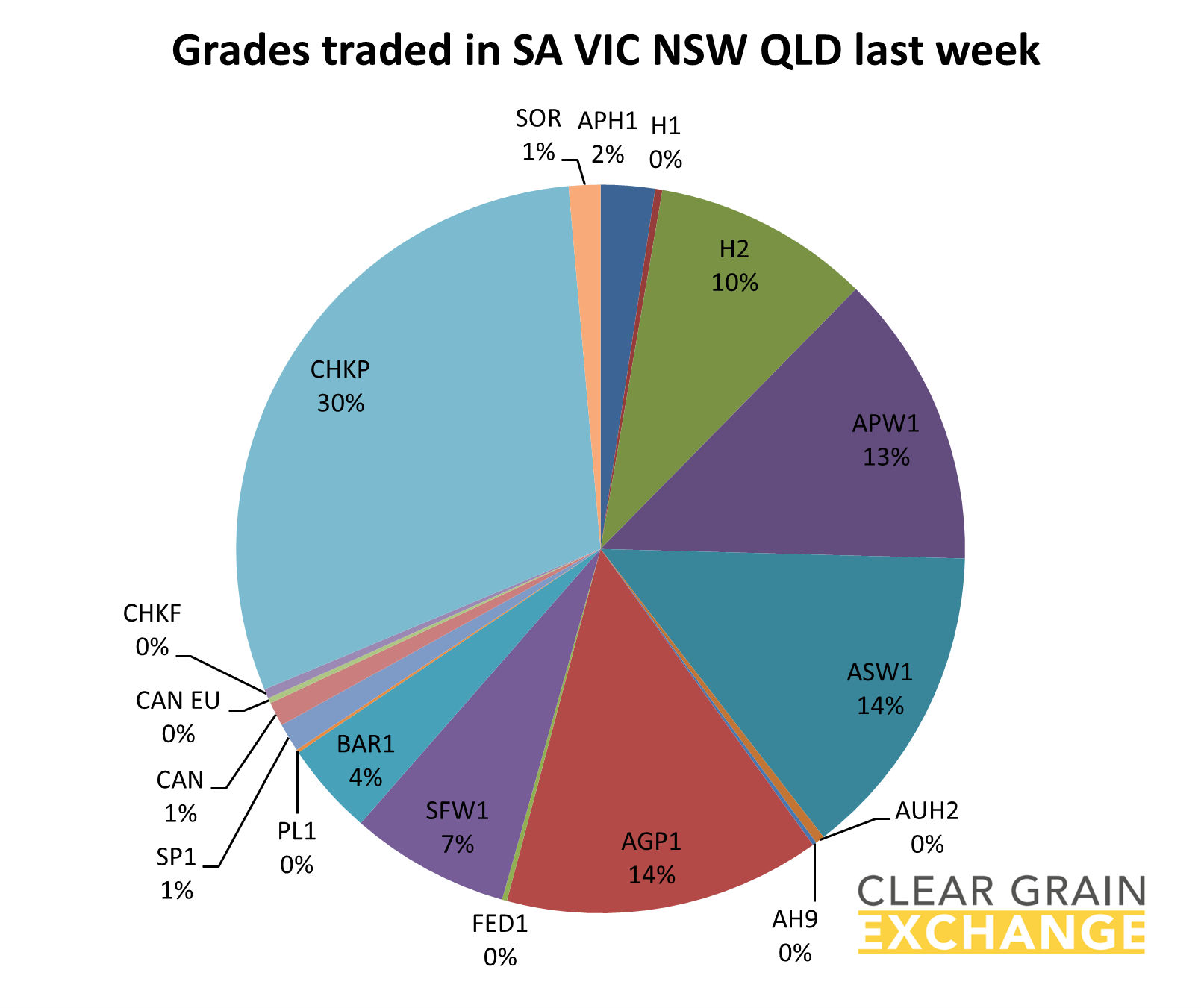 This is just a snapshot of prices traded last week. 26 different grades of wheat, barley, canola, sorghum, oats, lupins and chickpeas traded across 11 port zones around Australia on the exchange last week.