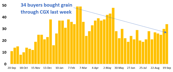 34 buyer businesses purchased grain through Clear Grain Exchange (CGX) last week. More buyers were searching for grain offered for sale.