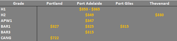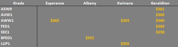 Note: GTA location differentials are used to convert prices to a port equivalent price, actual freight rates can differ particularly in the eastern states. You can offer any grade for sale to create demand.