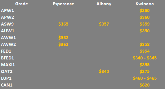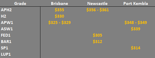 Note: GTA location differentials are used to convert prices to a port equivalent price, actual freight rates can differ particularly in the eastern states. You can offer any grade for sale to create demand.