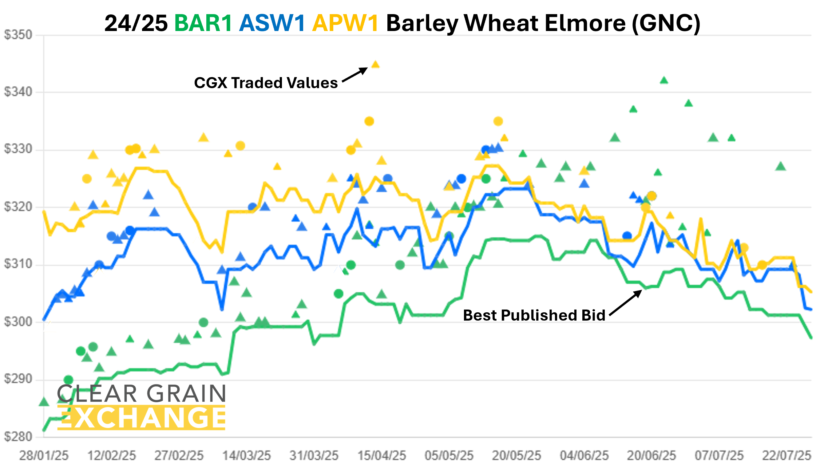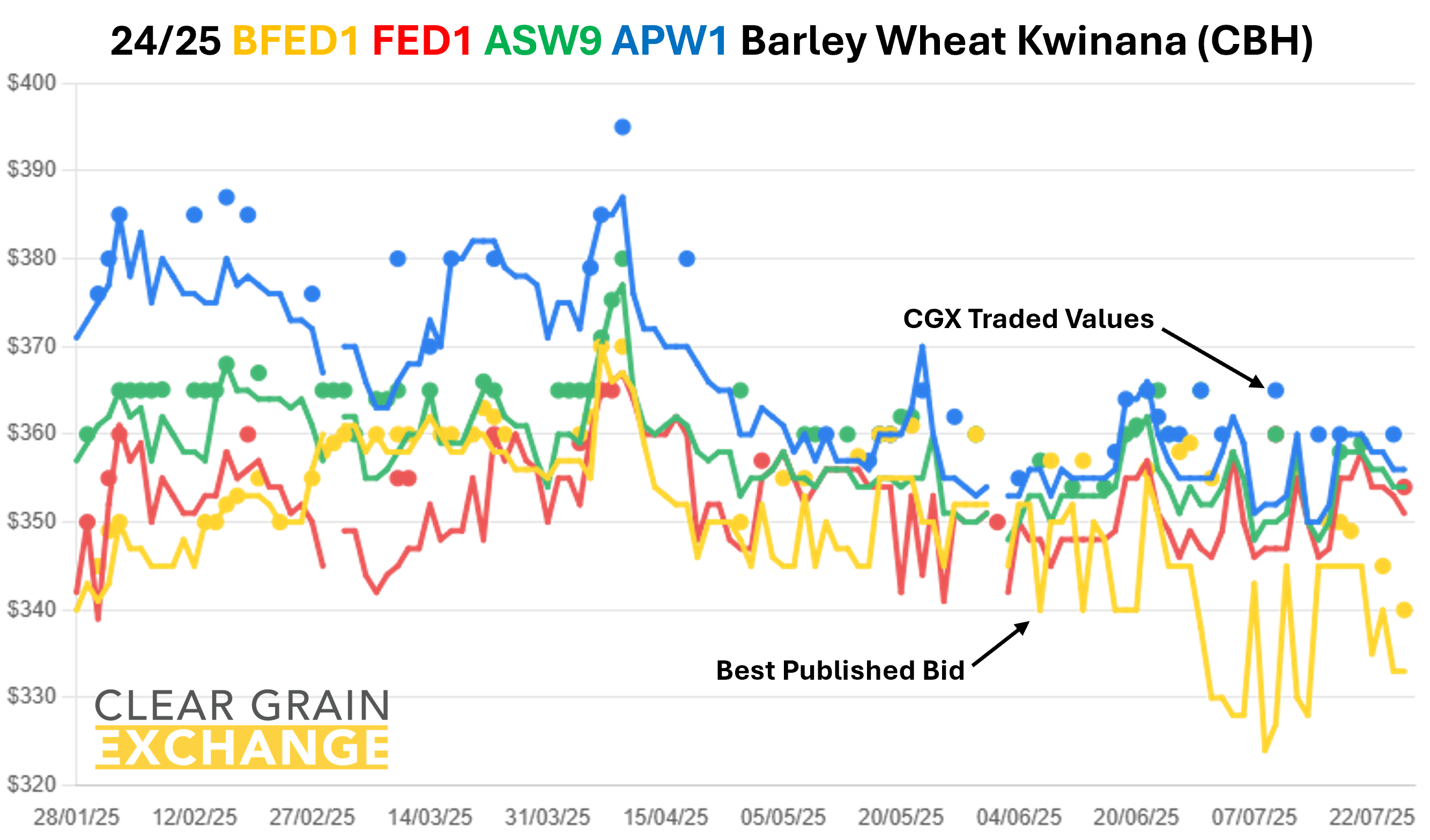 The prices traded through the exchange at a port track or FIS (in WA) level are provided below, but if you're reading this email you will have your own CGX account so login and use it to see what's trading, what's offered, and what's being bid at sites to help you determine the value of grain in your area.