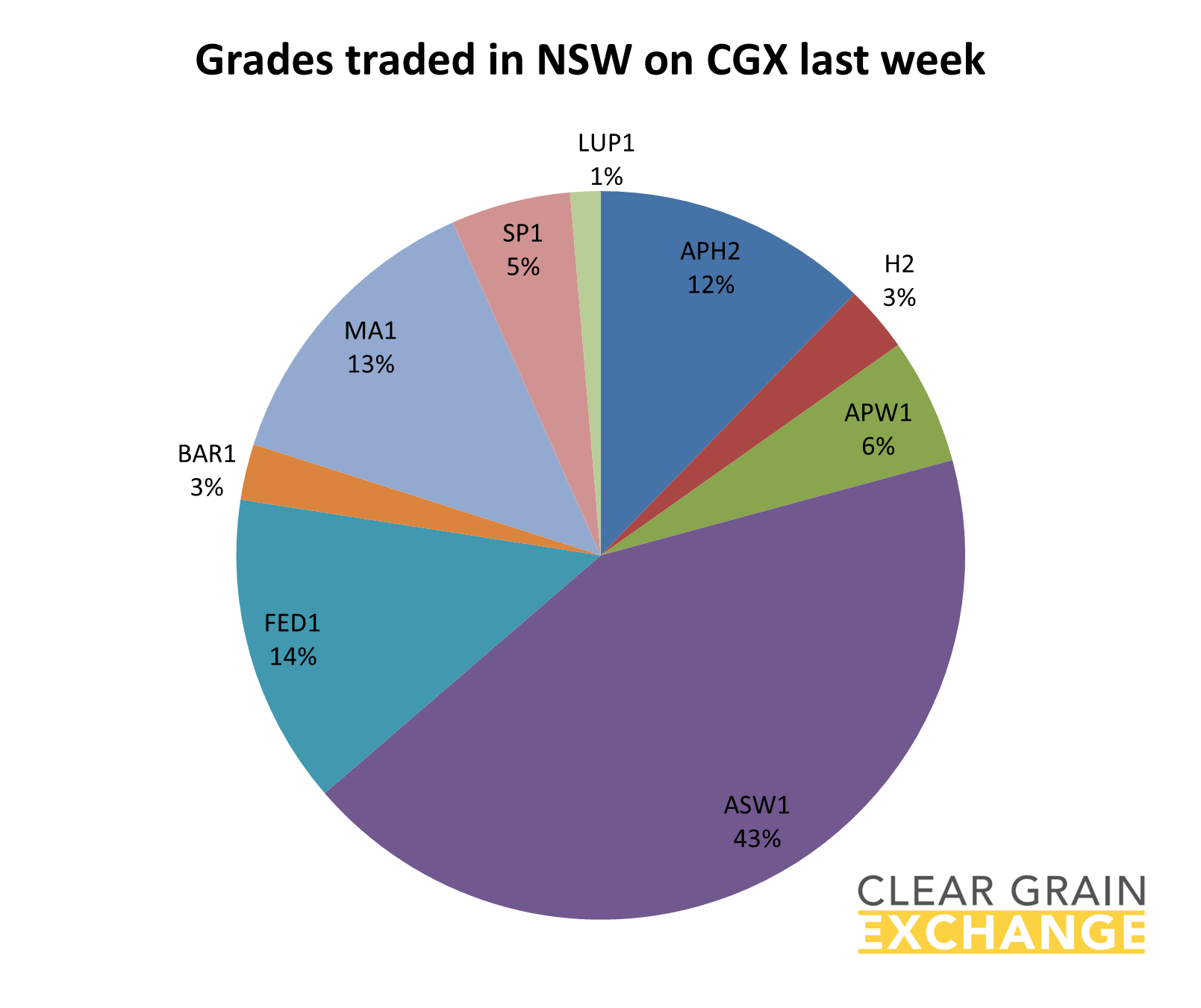 100 buyers searched warehouse and on-farm grain for sale last week - 23 grades of wheat, barley, canola, lupins and oats sold to 31 buyers that met grower prices indicating breadth of demand.
