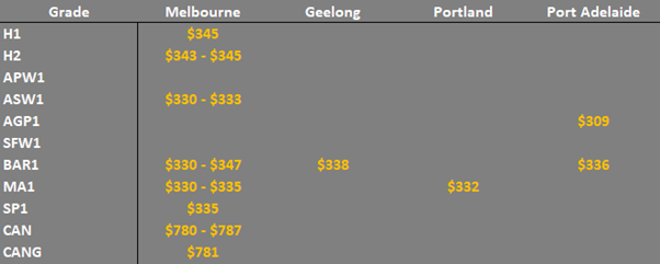 Feed barley was trading $347/t Melbourne, $336/t Pt Adelaide and $345/t Kwinana.