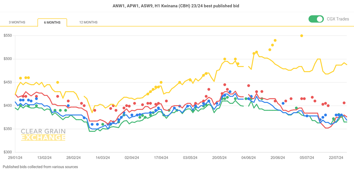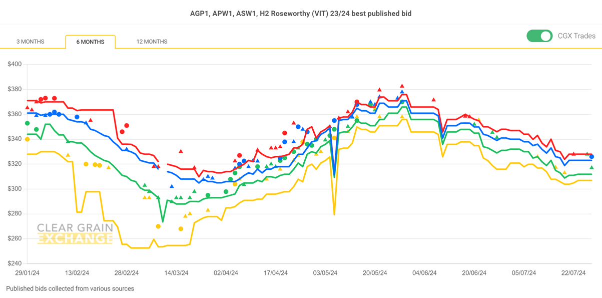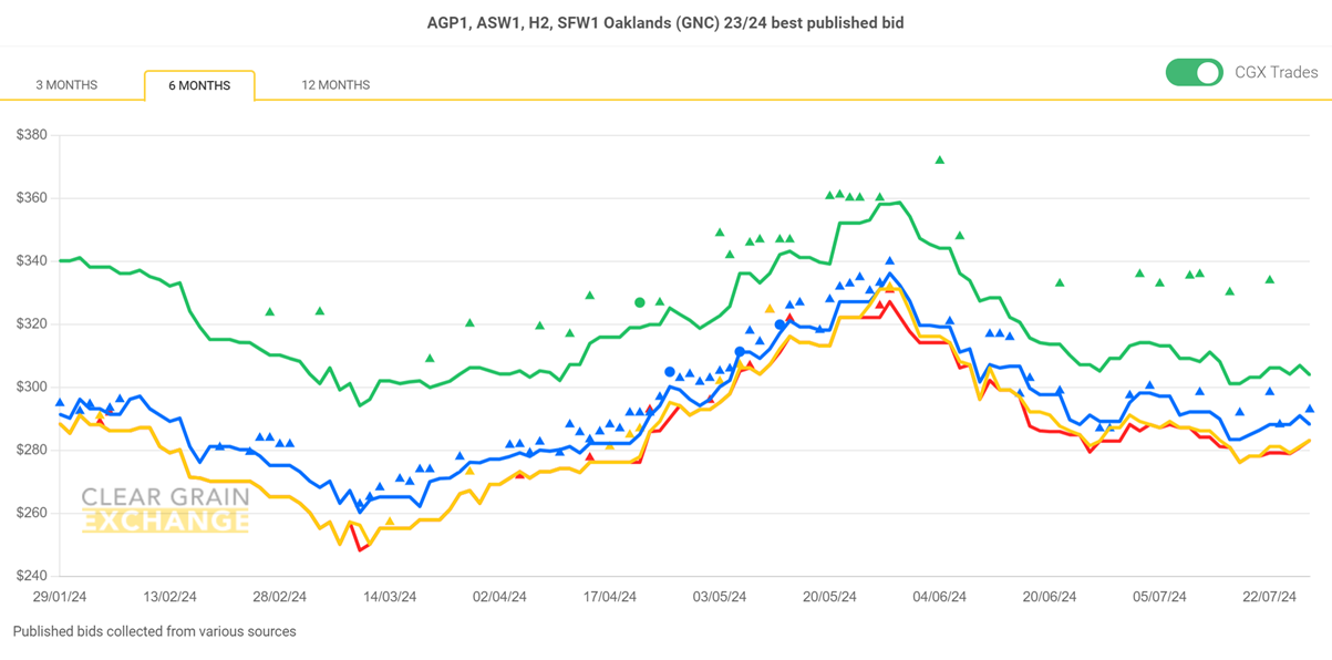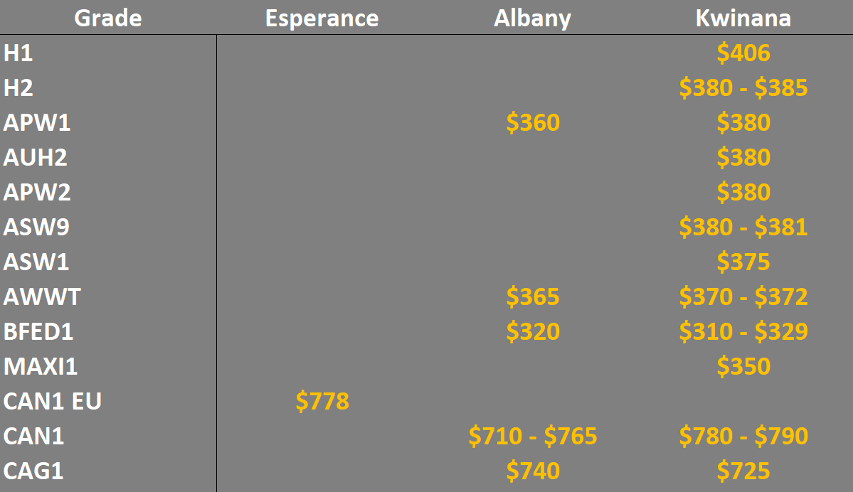 Note: GTA location differentials are used to convert prices to a port equivalent price, actual freight rates can differ particularly in the eastern states. You can offer any grade for sale to create demand.