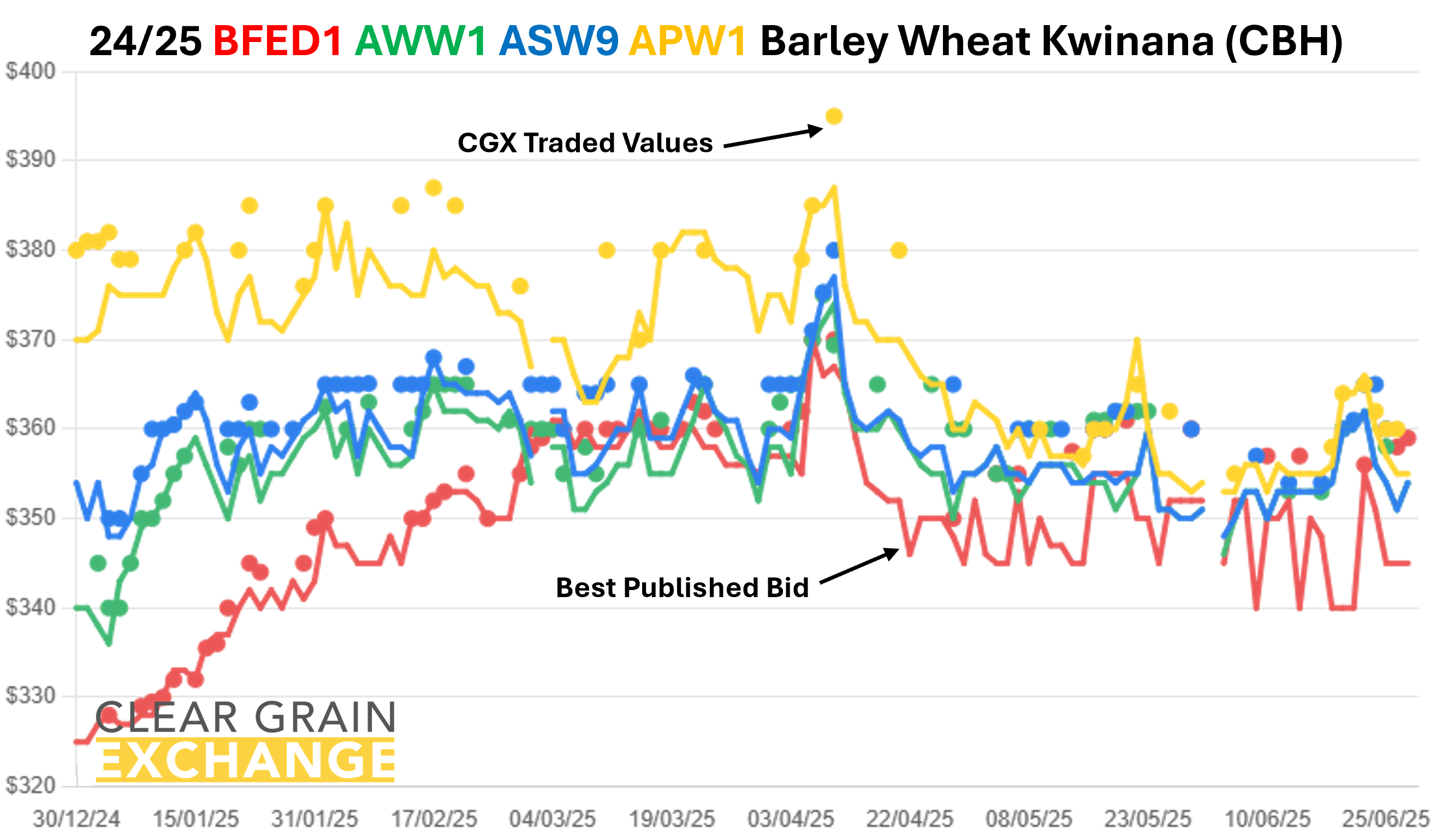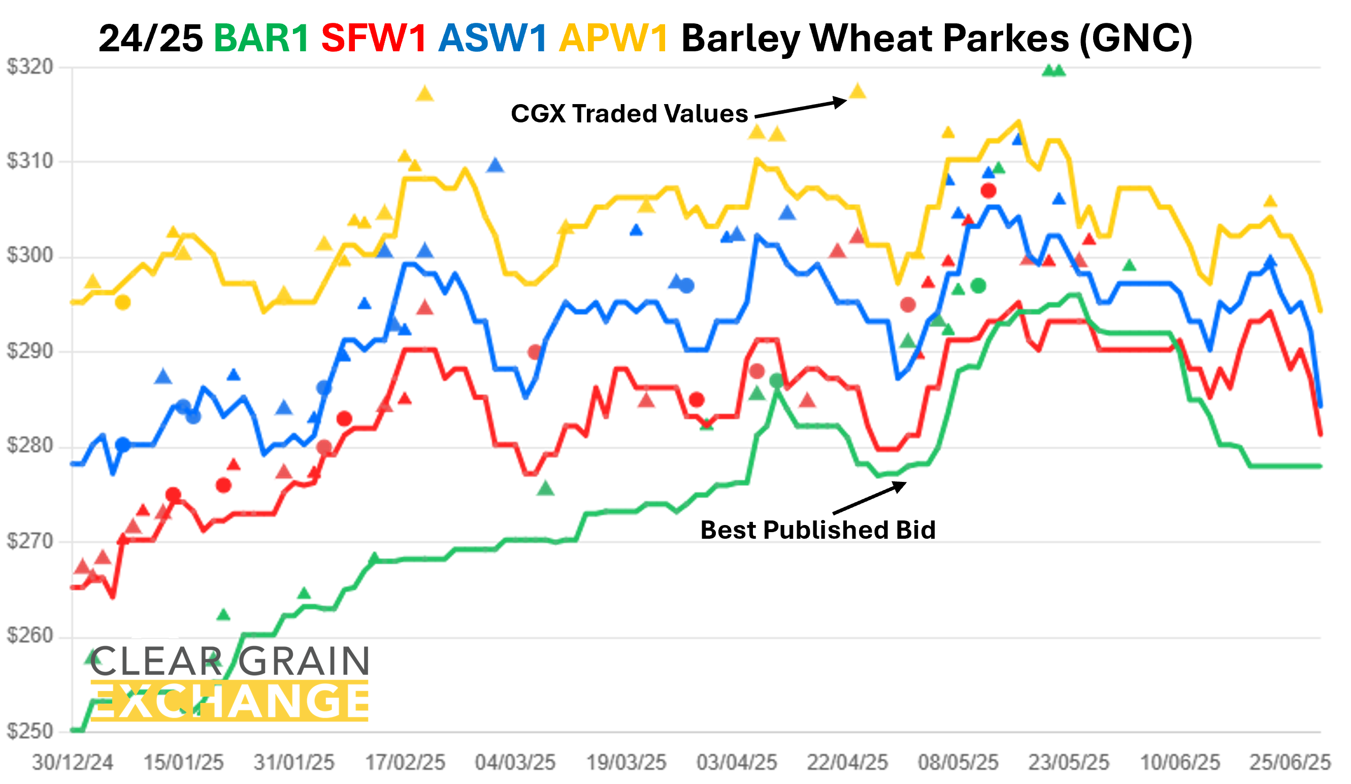 The prices traded through the exchange at a port track or FIS (in WA) level are provided below, but if you're reading this email you will have your own CGX account so login and use it to see what's trading, what's offered, and what's being bid at sites to help you determine the value of grain in your area.