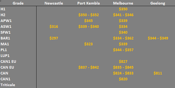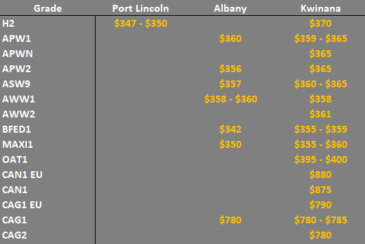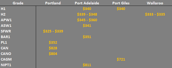 Note: GTA location differentials are used to convert prices to a port equivalent price, actual freight rates can differ particularly in the eastern states. You can offer any grade for sale to create demand.