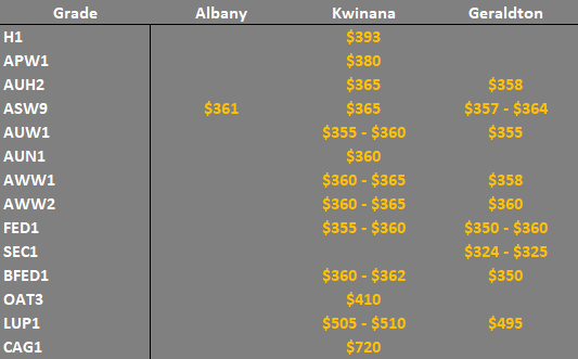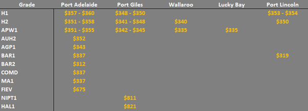 Note: GTA location differentials are used to convert prices to a port equivalent price, actual freight rates can differ particularly in the eastern states. You can offer any grade for sale to create demand.