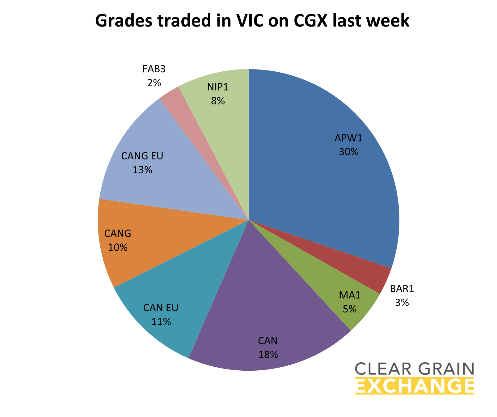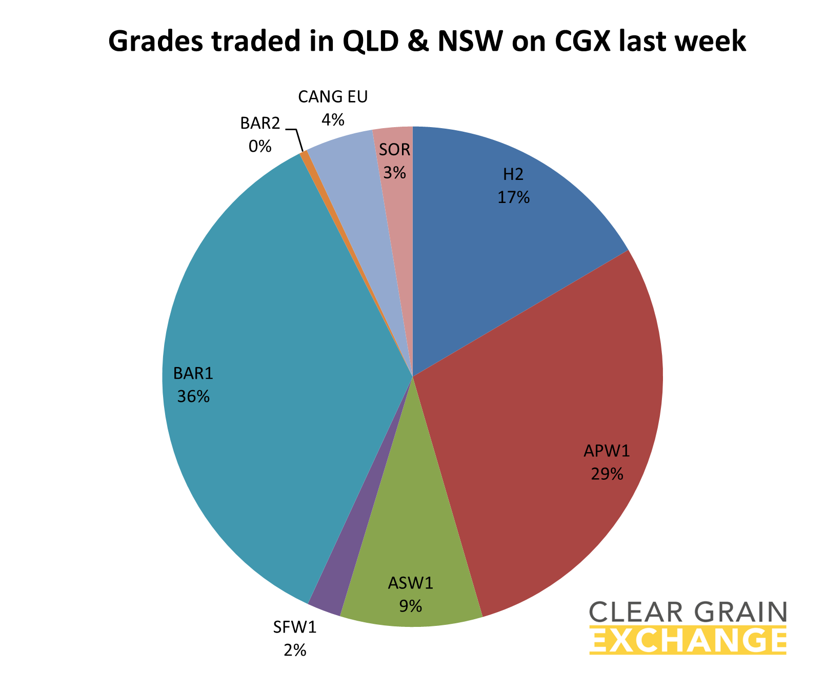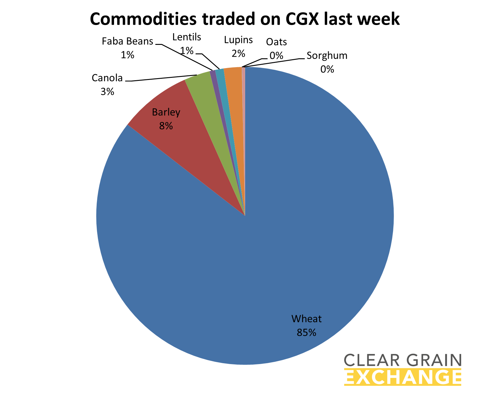 Last week many pockets of demand were across wheat grades with 25 buyer businesses bidding up to purchase 14 grades of wheat across Australia to make up 85% of all grain traded through Clear Grain Exchange (CGX) last week.