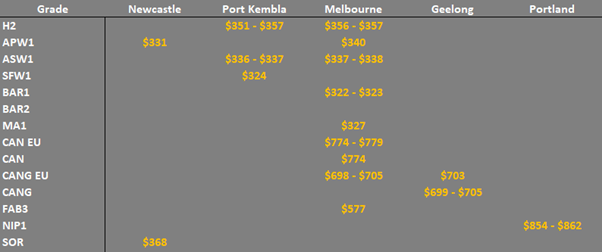 For example, Port Giles in SA was attracting strong demand for the higher protein wheat grades, H2 and ASW1 offers in Port Kembla were attracting buyers, while Kwinana and Geraldton port zones saw strong demand across numerous grades.