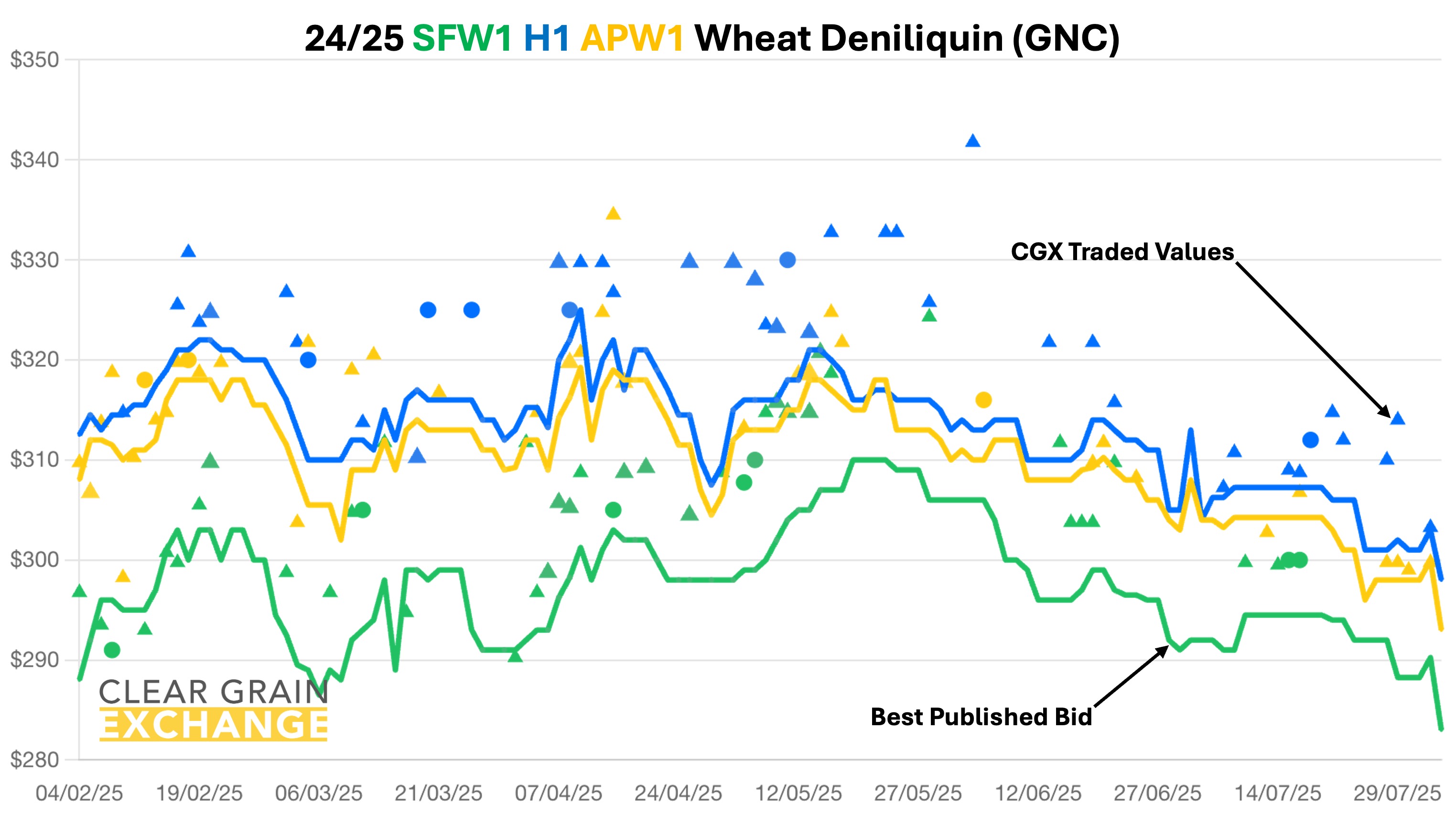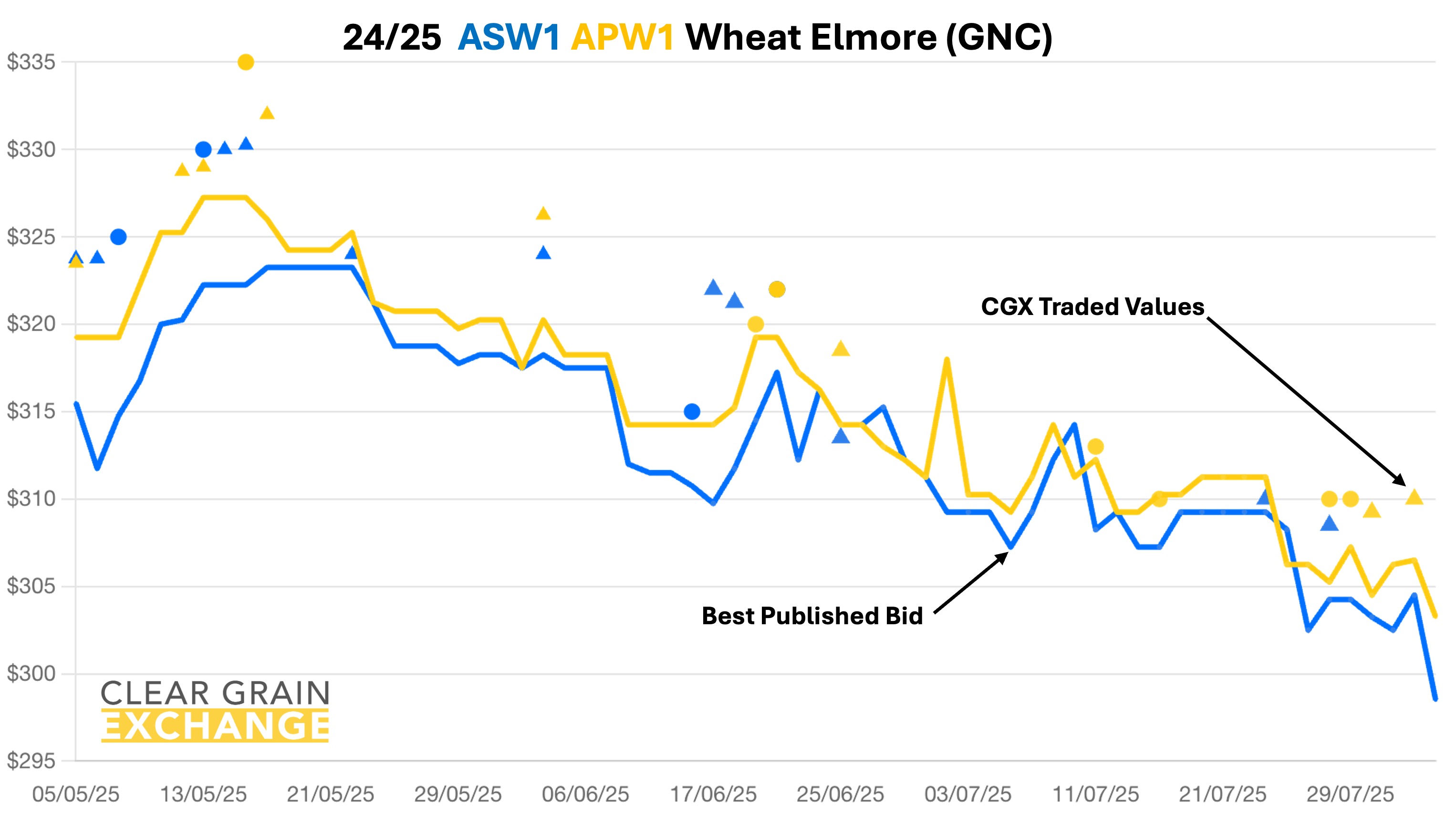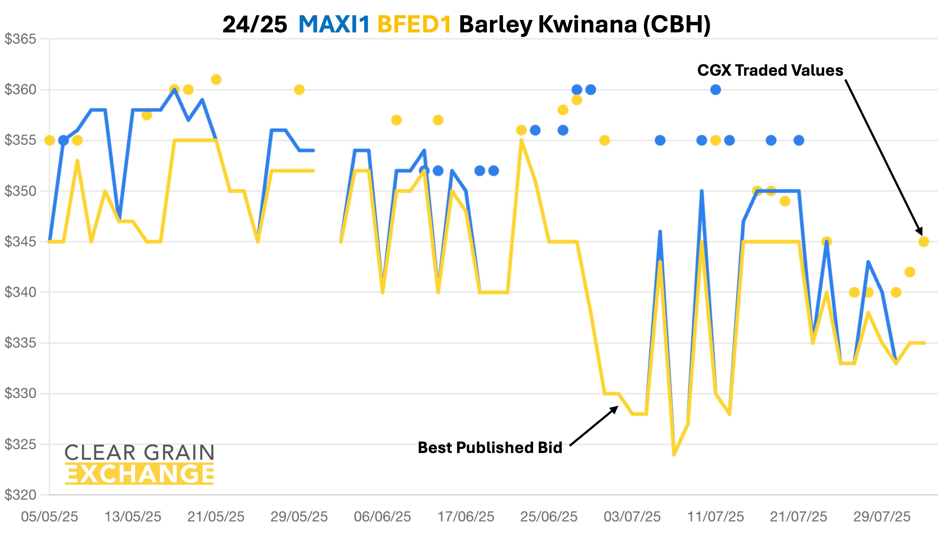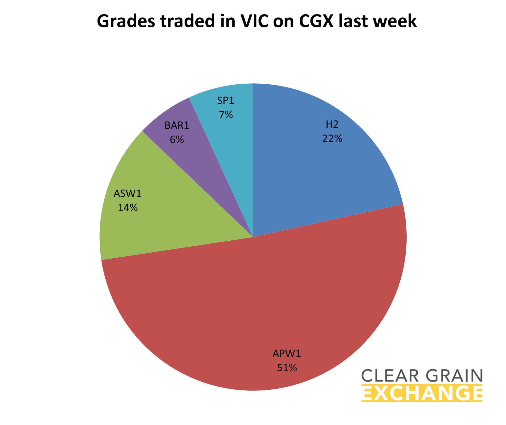 The prices traded through the exchange at a port track or FIS (in WA) level are provided below, but if you're reading this email you will have your own CGX account so login and use it to see what's trading, what's offered, and what's being bid at sites to help you determine the value of grain in your area.