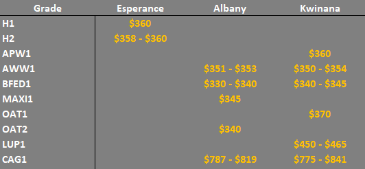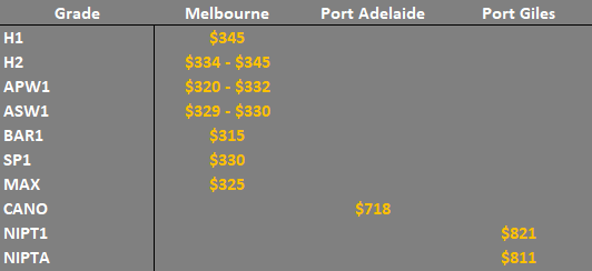 Note: GTA location differentials are used to convert prices to a port equivalent price, actual freight rates can differ particularly in the eastern states. You can offer any grade for sale to create demand.