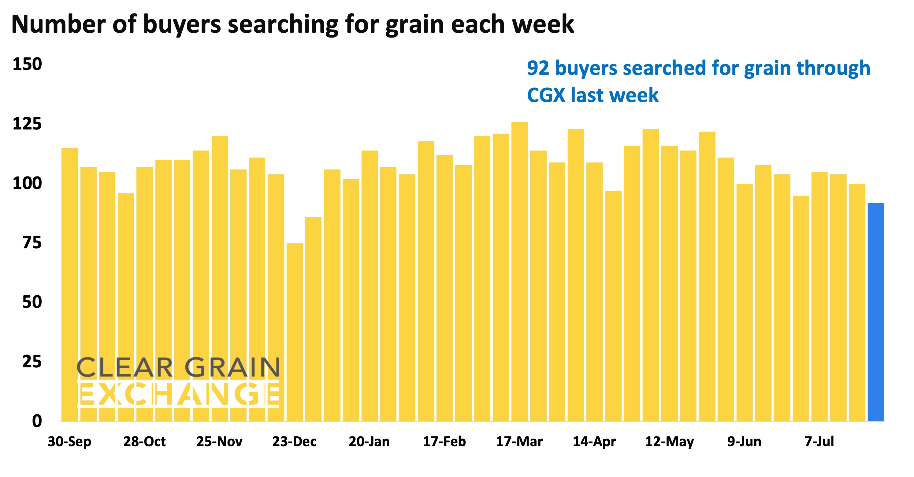 There are plenty of buyers that want Australian grain. There are consistently more than 100 buyer organisations searching for grain offered for sale on Clear Grain Exchange (warehoused grain) and igrainX (on-farm grain).