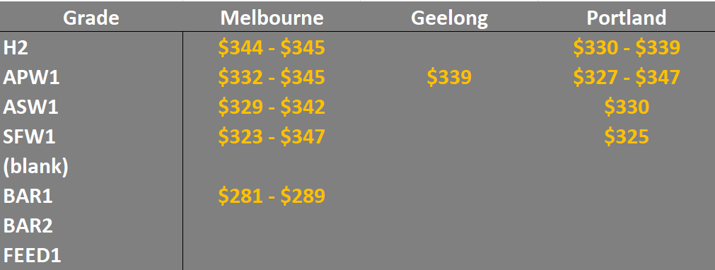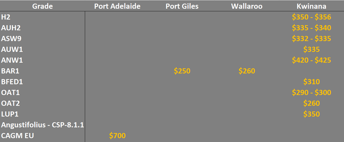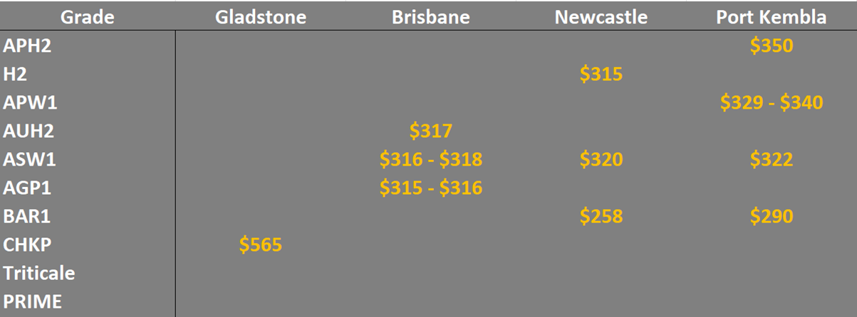 Note: GTA location differentials are used to convert prices to a port equivalent price, actual freight rates can differ particularly in the eastern states. You can offer any grade for sale to create demand.