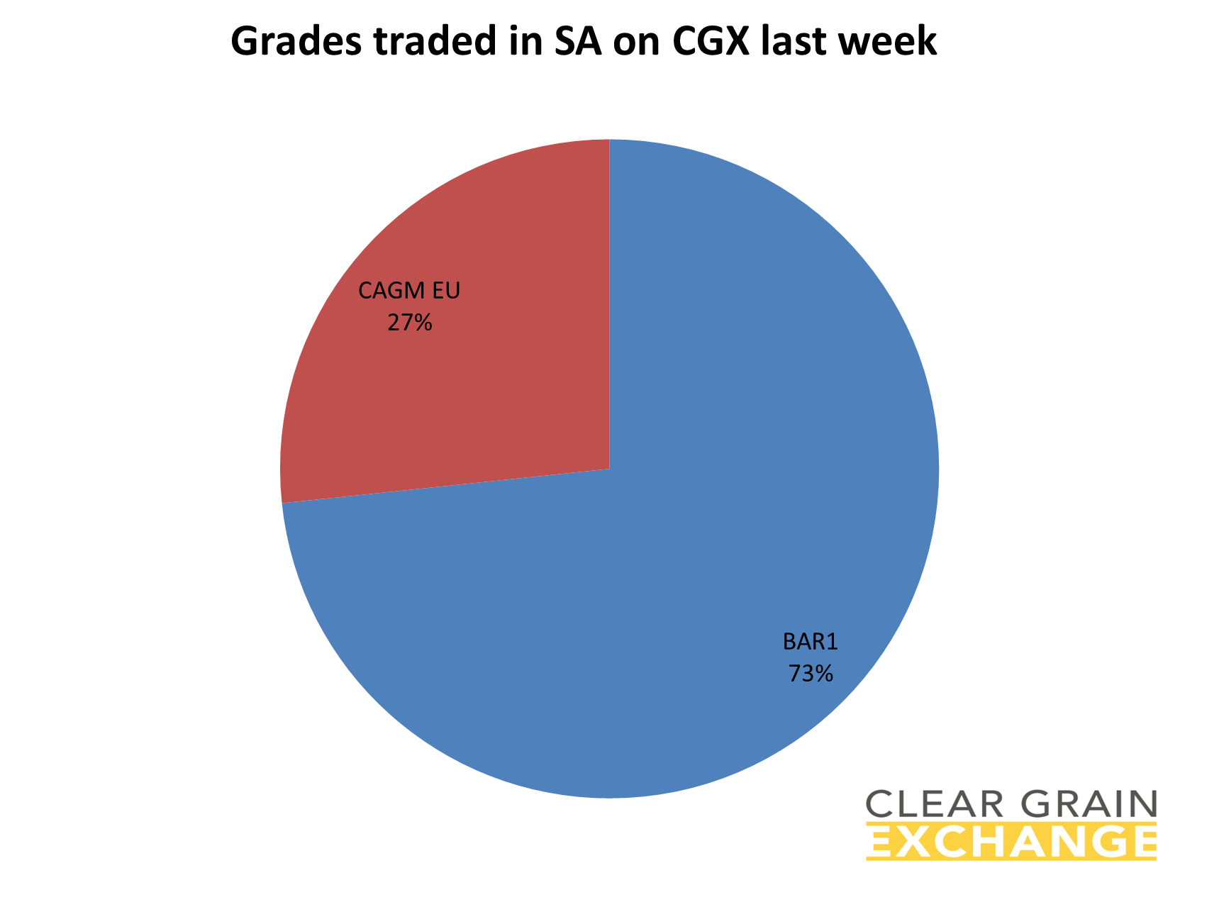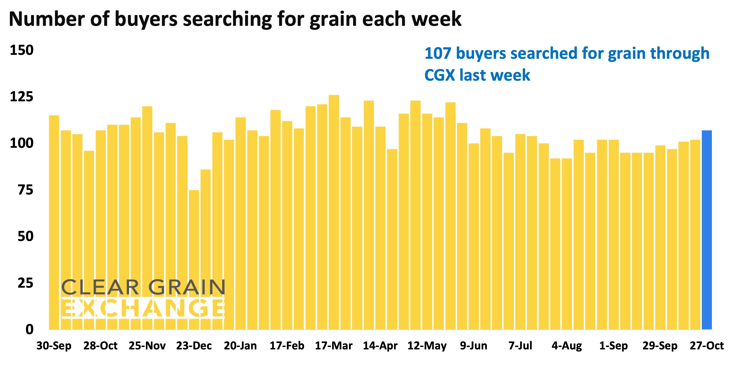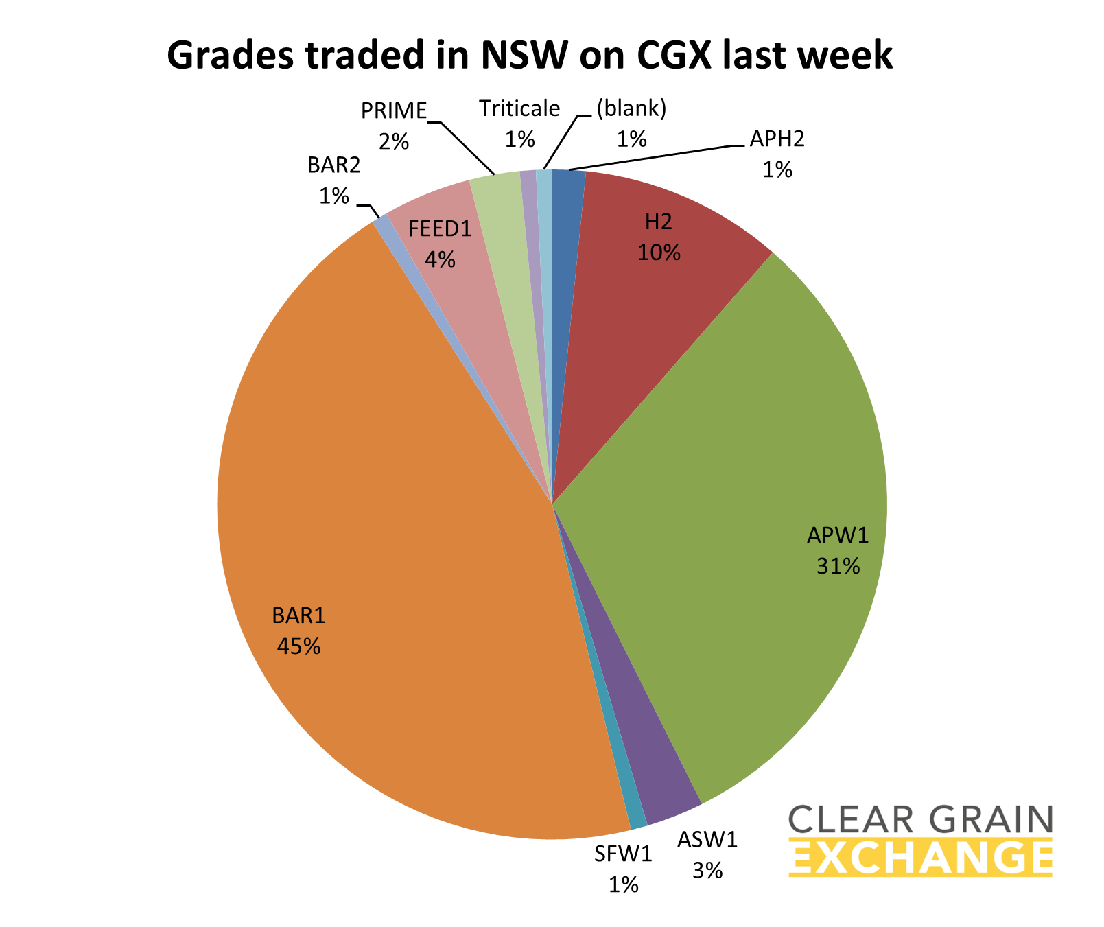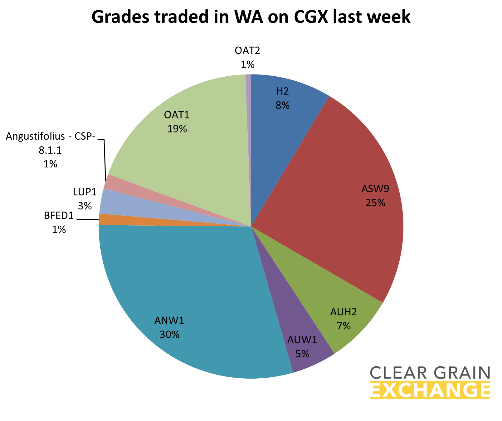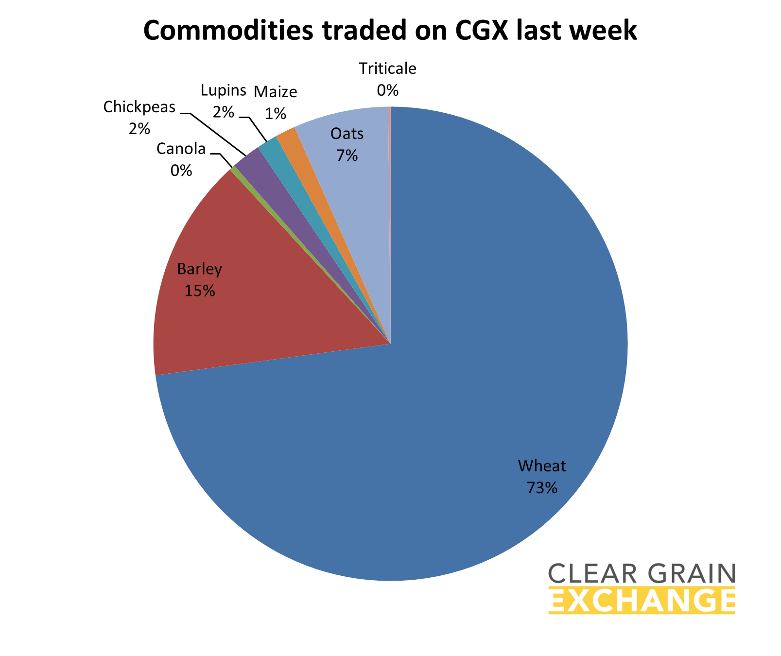 Last week 23 grades of wheat, barley, canola, chickpeas, lupins, maize, oats and triticale traded with 30 buyers purchasing and 34 buyers bidding for grain. 107 buyers made 3,620 searches for grain offered for sale.