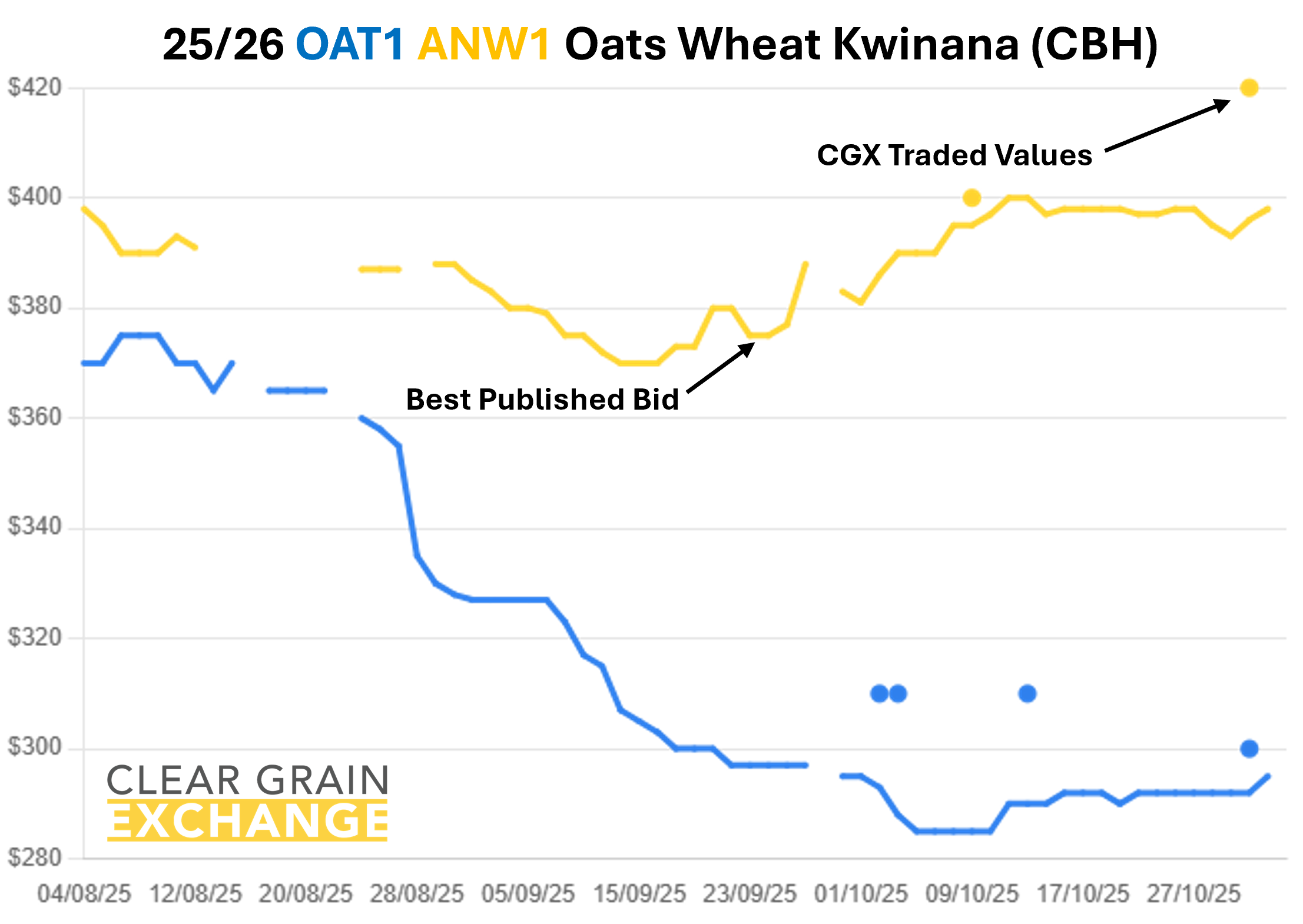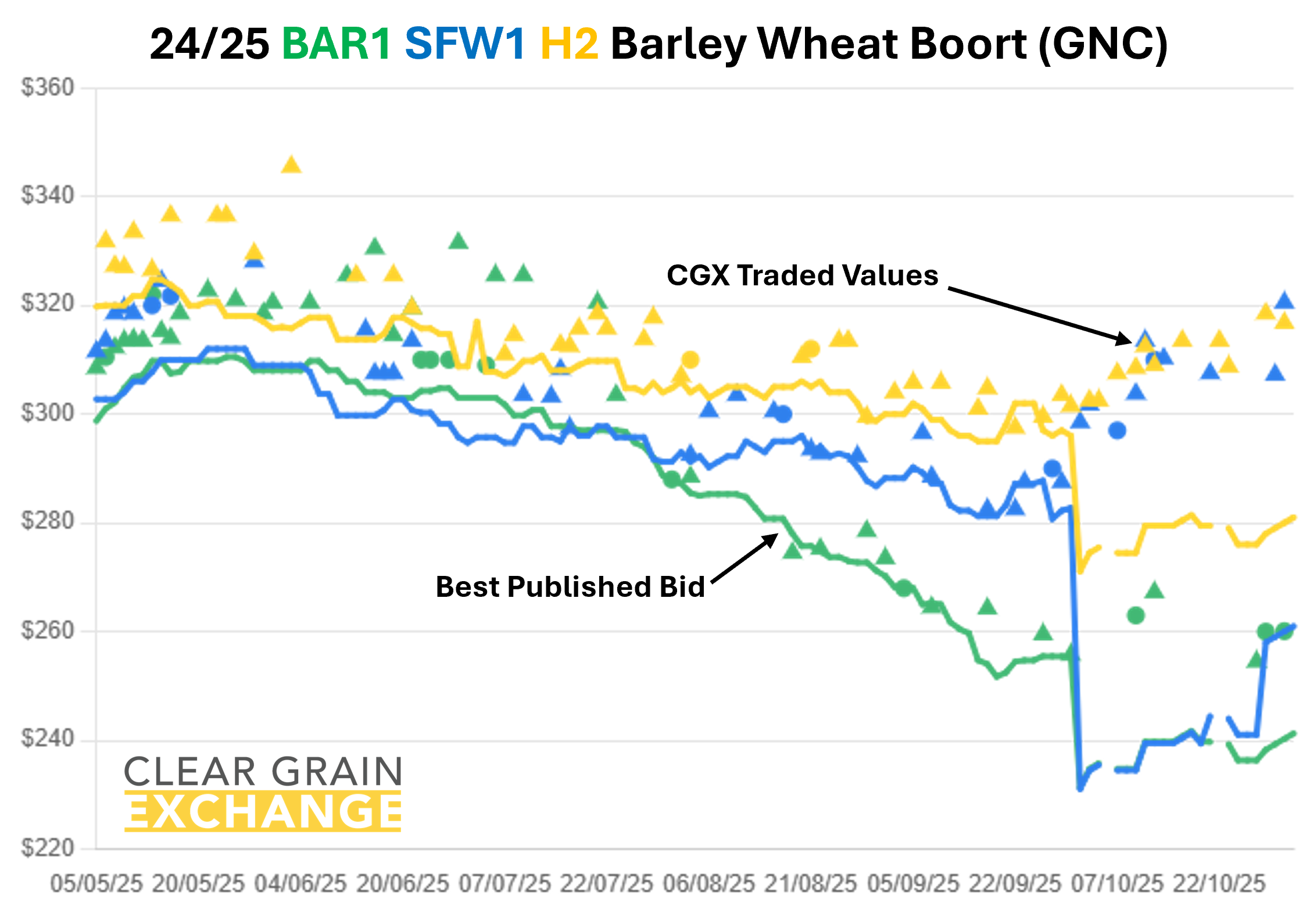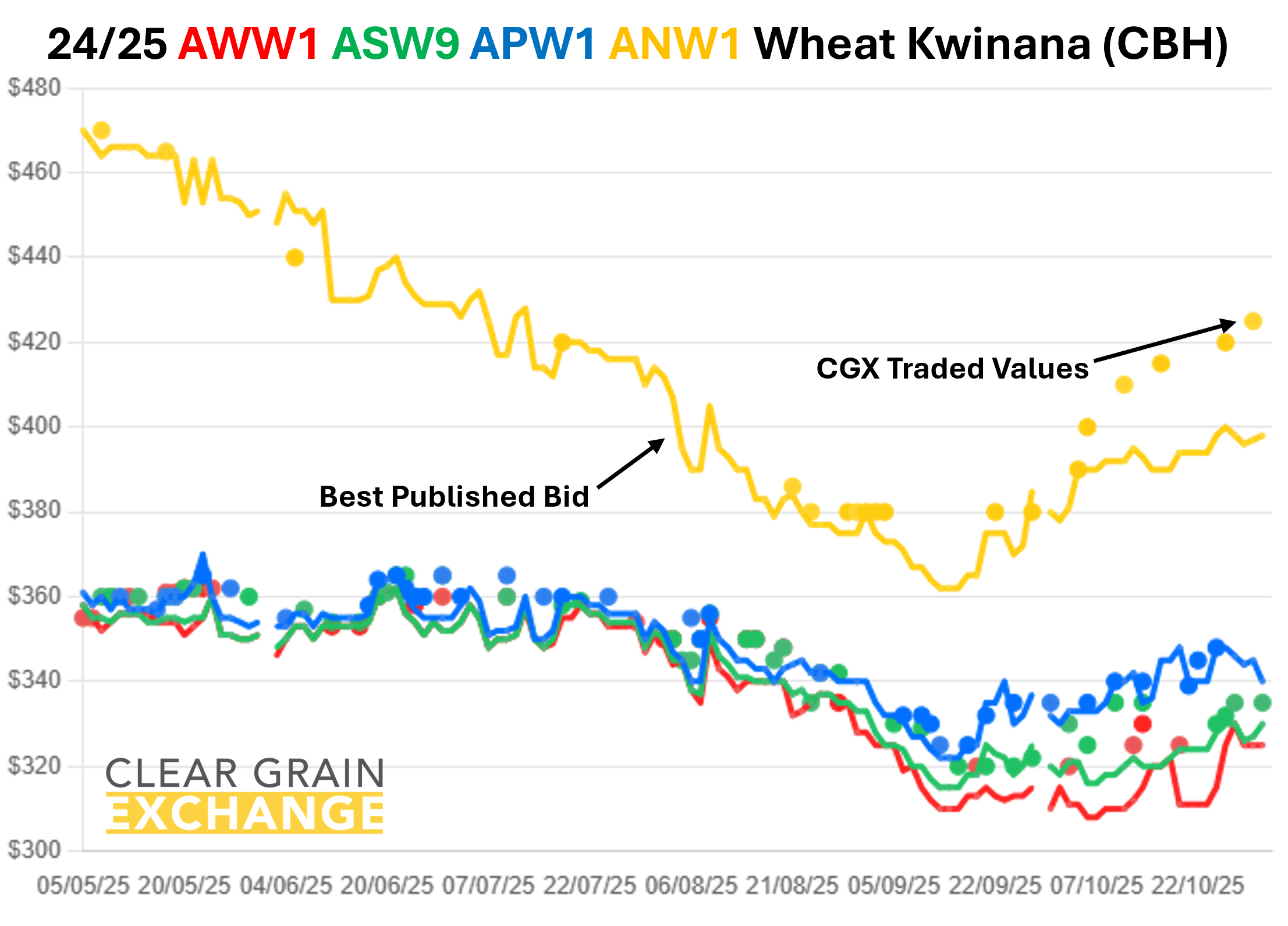 The prices traded through the exchange at a port track (eastern states) or FIS (in WA) level are provided below, but if you're reading this email you will have your own CGX account so login and use it to see what's trading, what's offered, and what's being bid at sites to help you determine the value of grain in your area.