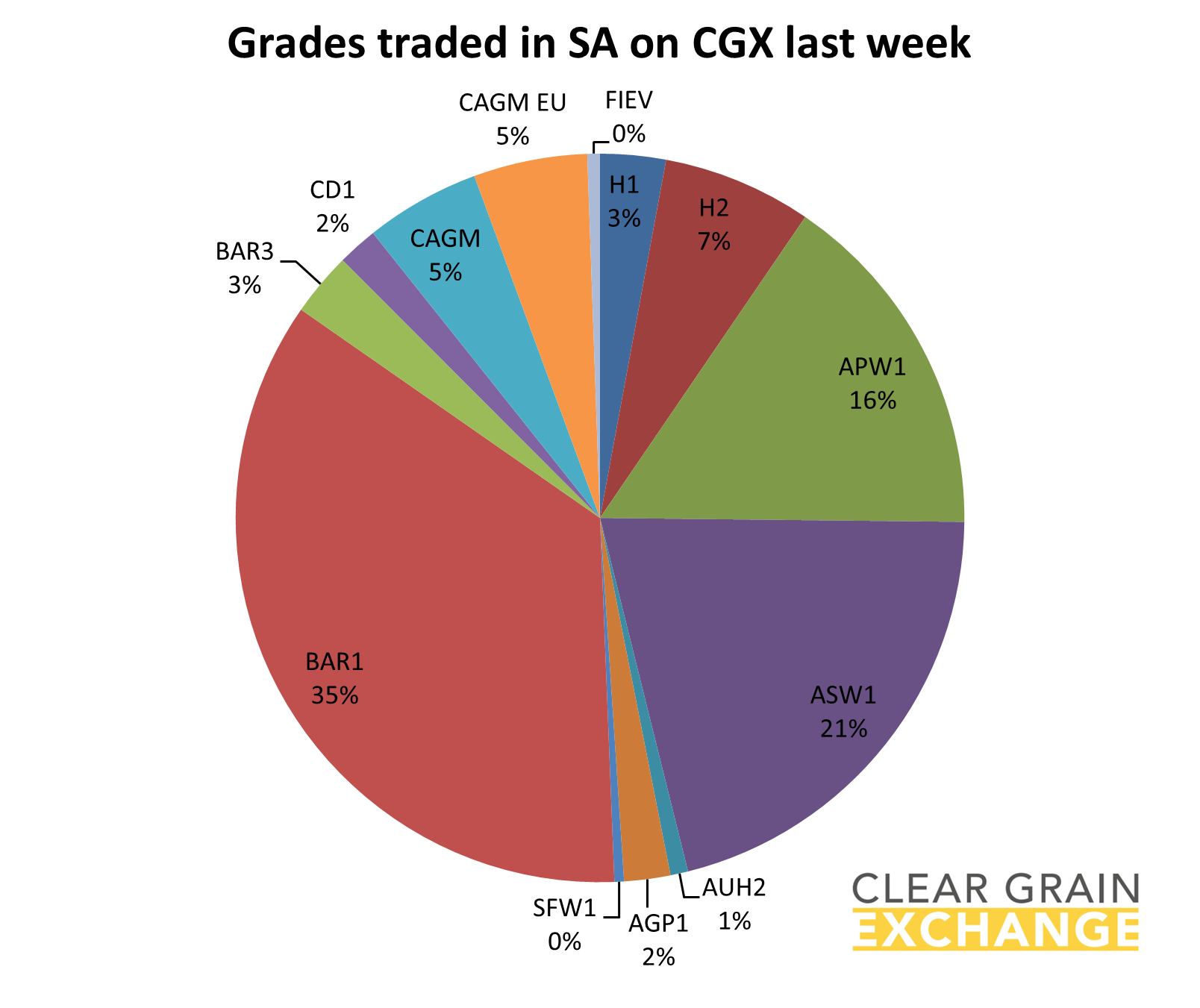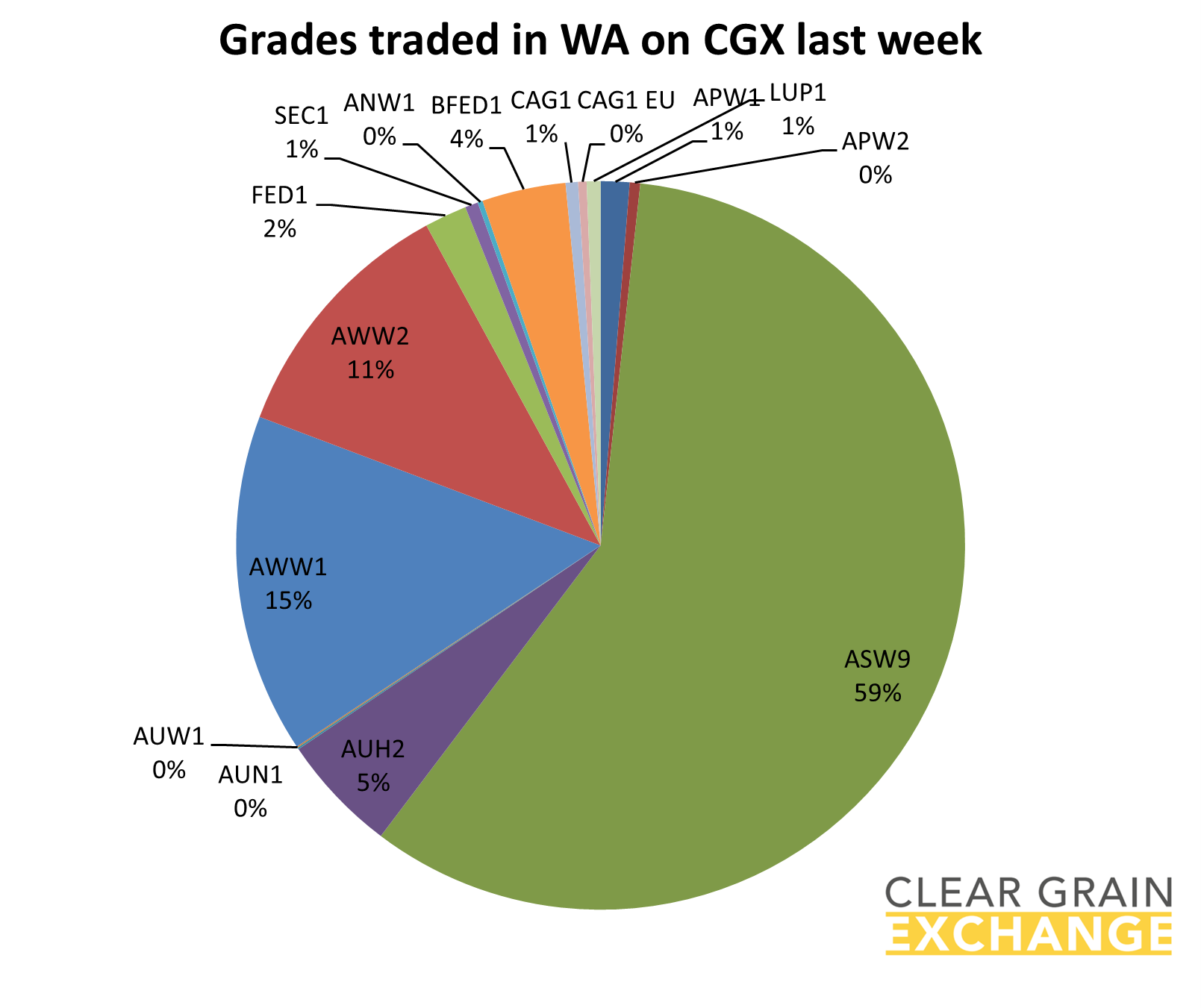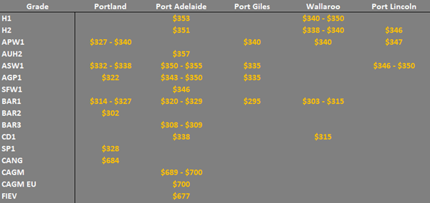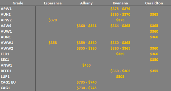 Most of the wheat that traded was APW1 and below grades including off-spec, feed and even seconds, and prices were very similar across the grades. Some higher protein milling grades such as H1 and H2 were trading in SA and noodle in the west.