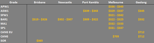 Note: GTA location differentials are used to convert prices to a port equivalent price, actual freight rates can differ particularly in the eastern states. You can offer any grade for sale to create demand.