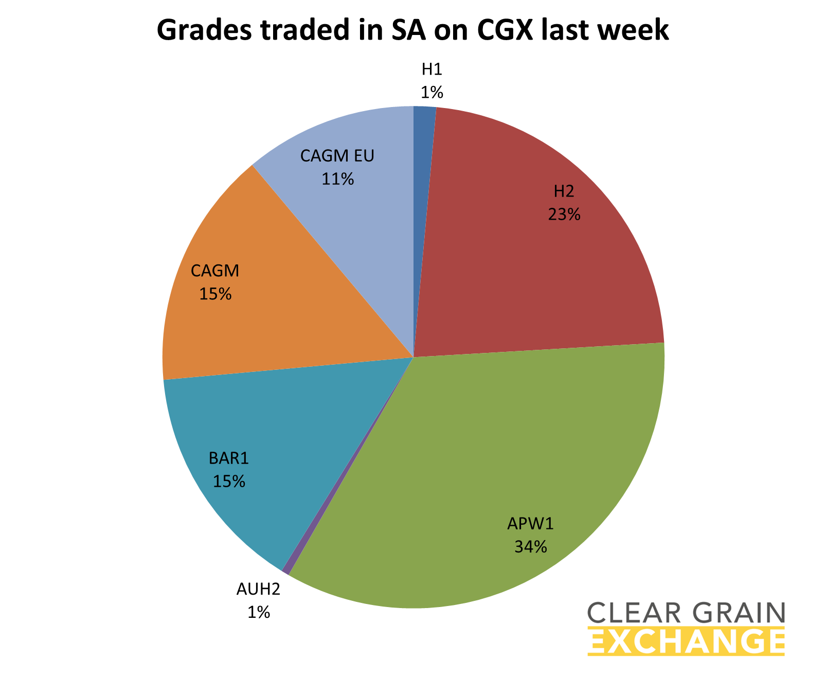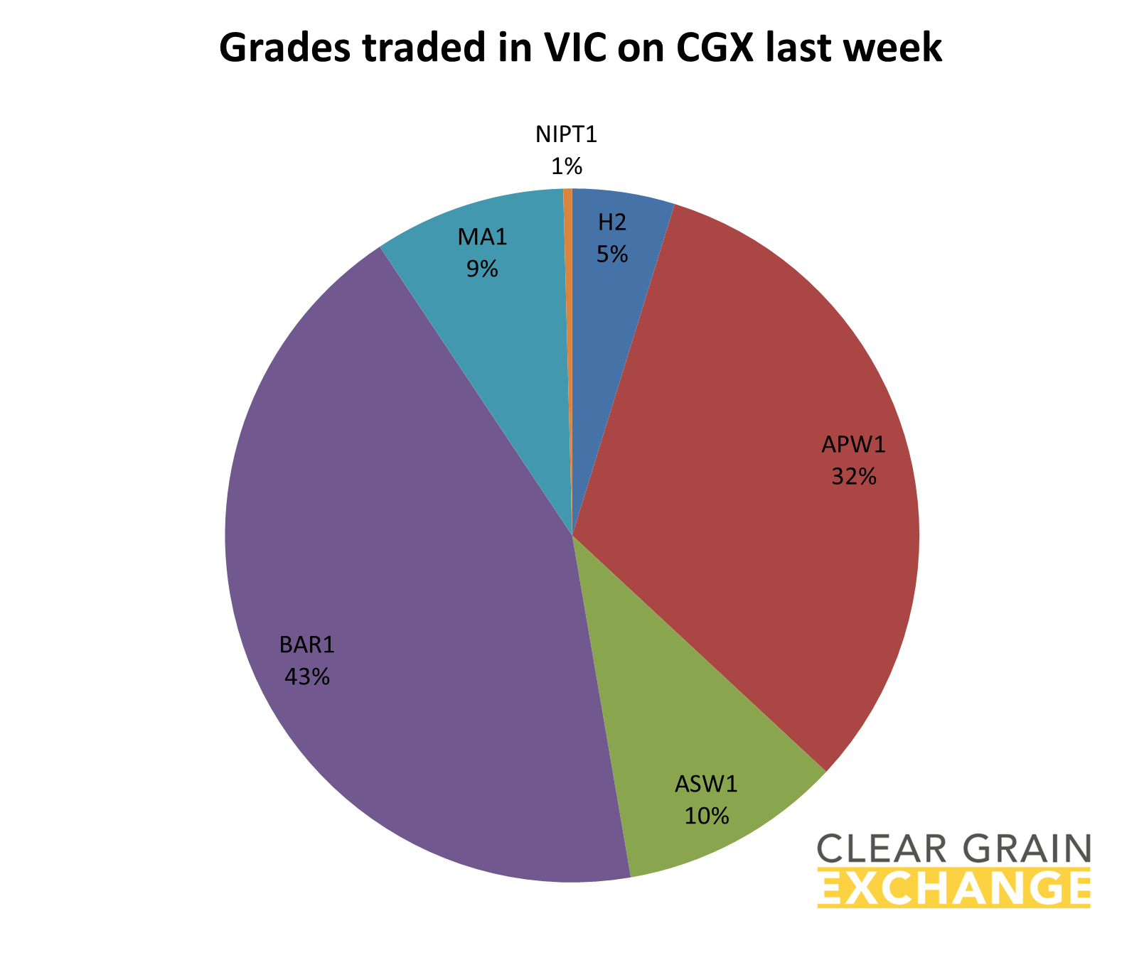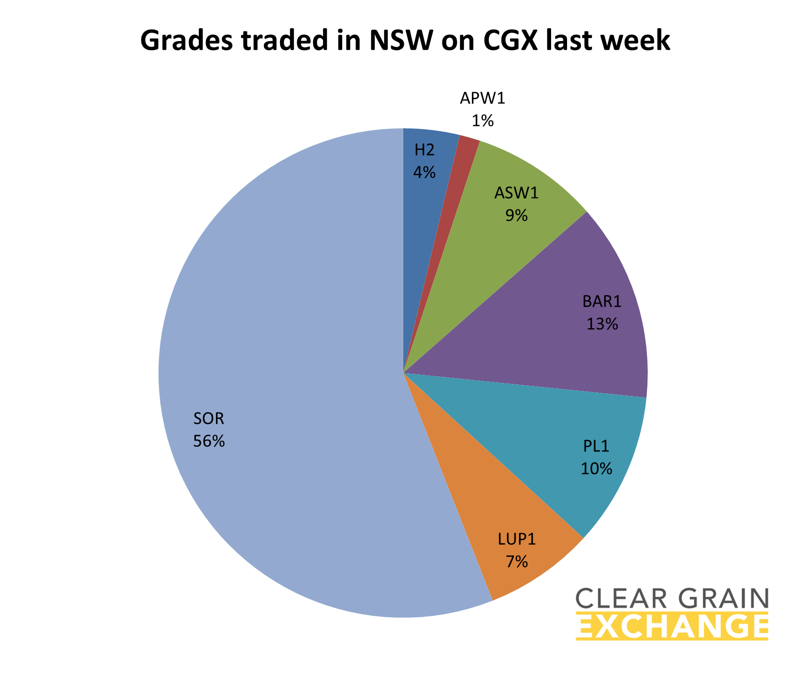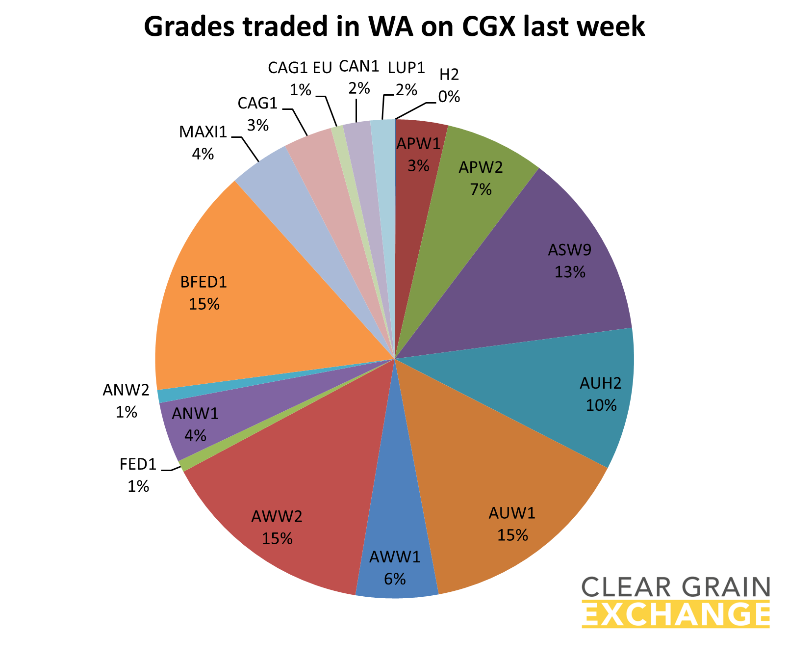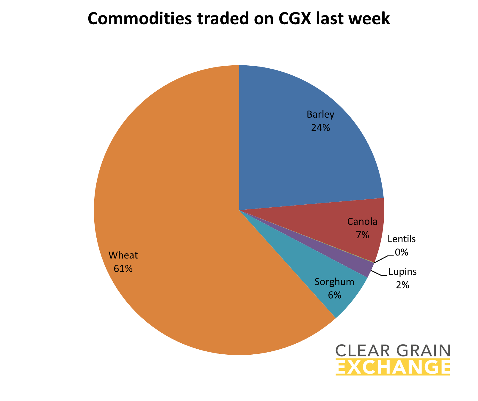 68 different selling businesses sold 26 grades of wheat, barley, canola, lentils, lupins and sorghum to 36 different buyers last week.