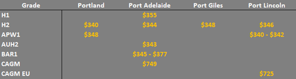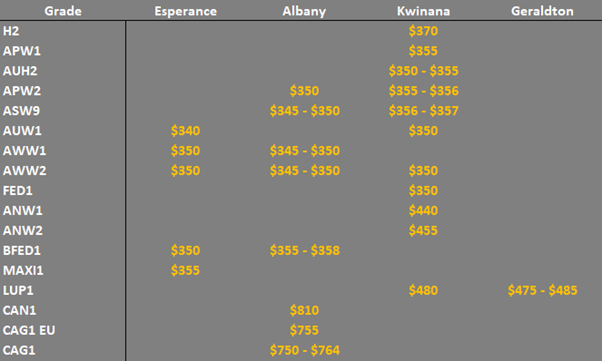Note: GTA location differentials are used to convert prices to a port equivalent price, actual freight rates can differ particularly in the eastern states. You can offer any grade for sale to create demand.