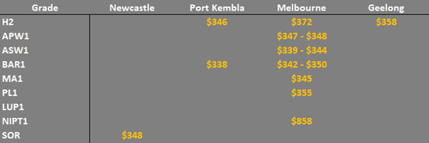 For example, last week canola grades were trading through WA and SA more than $50/t over best published bids collected from a number of sources. Barley grades were trading between $4-55/t better than best published bids across SA, WA, VIC and NSW. Multiple wheat grades were trading at prices anywhere from equal to published bids up to $27/t better than the best published bid at the site. Sorghum traded $4/t better than than the best bid at site in NSW.
