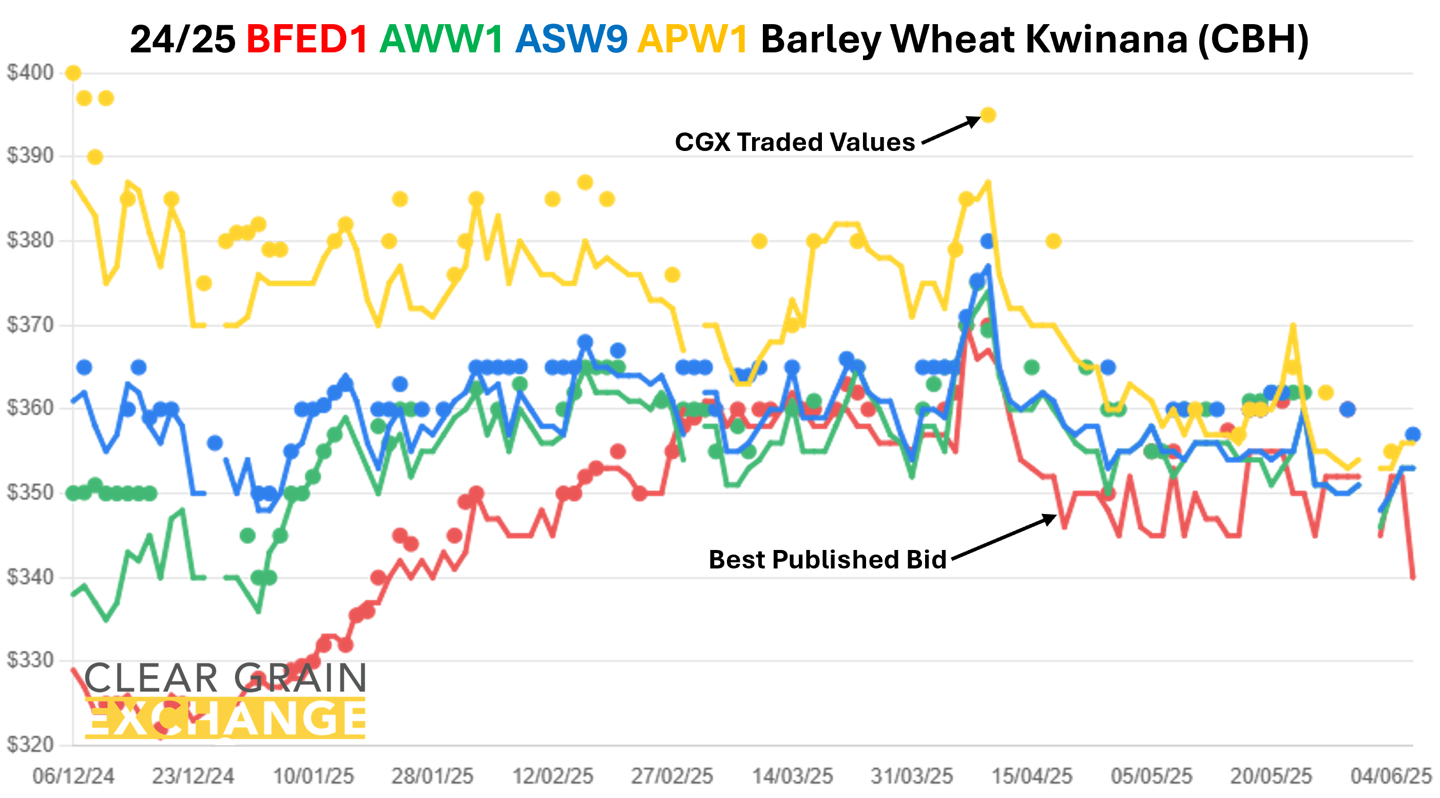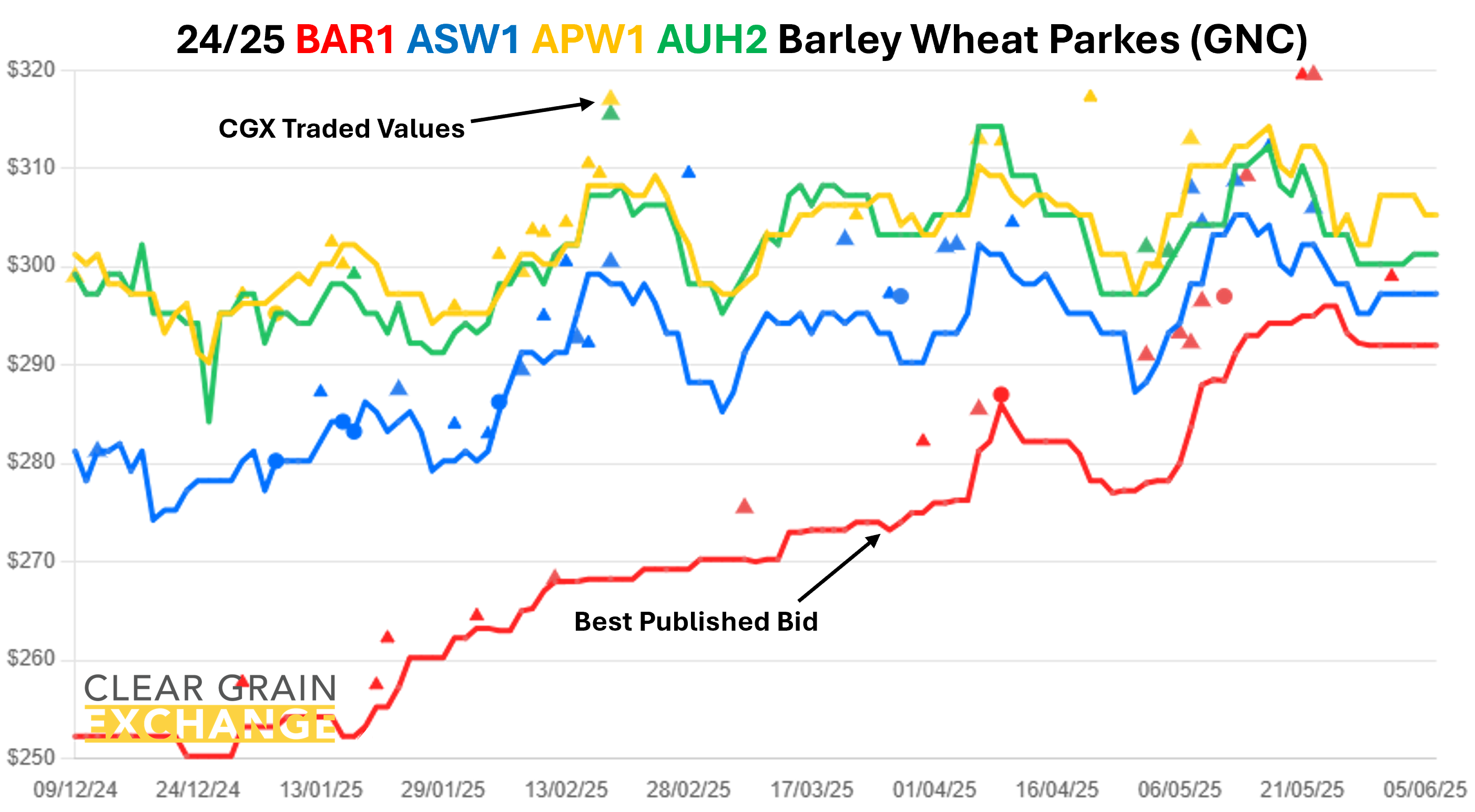 The prices traded through the exchange at a port track or FIS (in WA) level are provided below, but if you're reading this email you will have your own CGX account so login and use it to see what's trading, what's offered, and what's being bid at sites to help you determine the value of grain in your area.